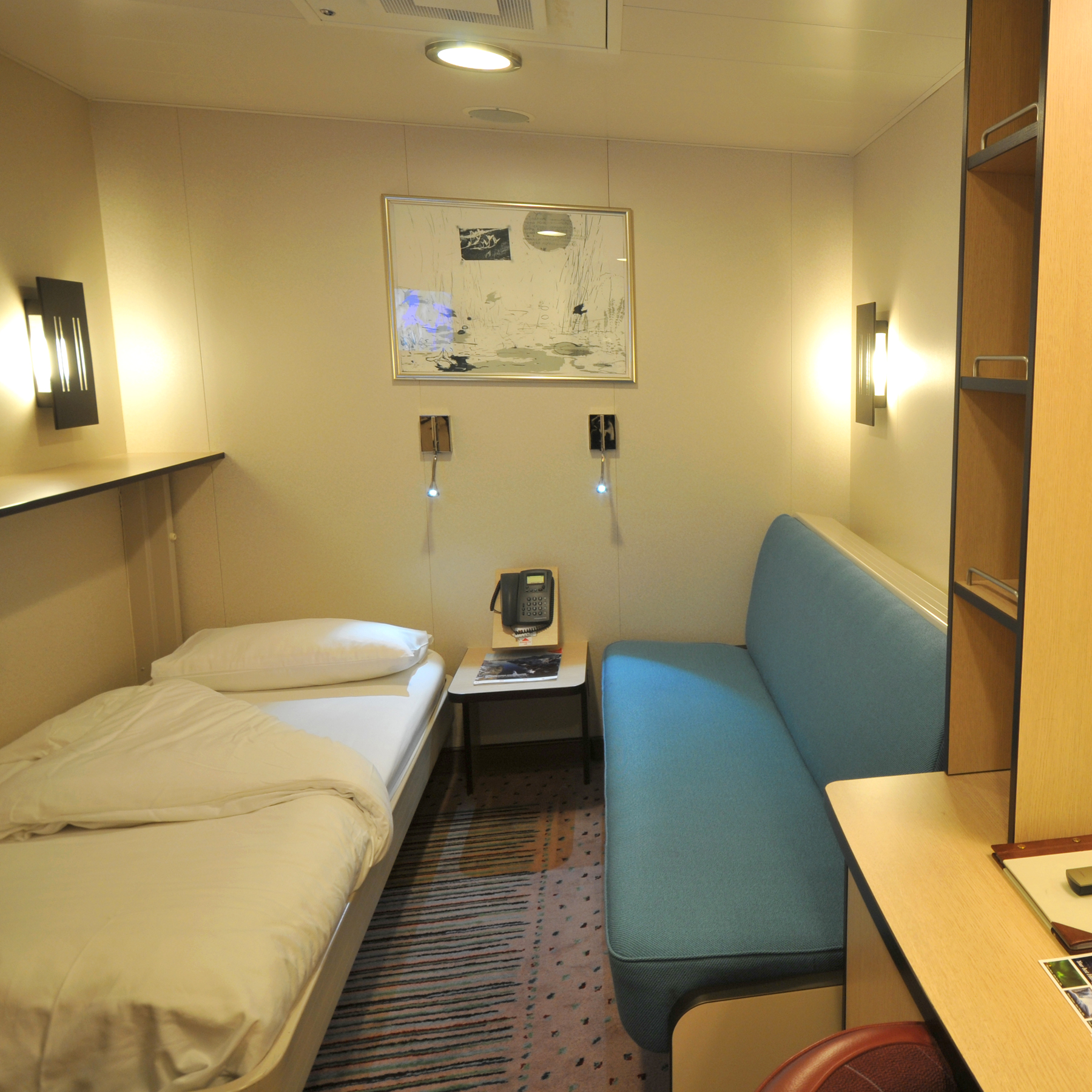 Our cosy Polar Inside cabins can be found on all decks. All cabins include bathrooms with shower/WC. Relax in these comfortable, standard inside cabins with separate beds where one can be turned into a sofa. This cabin can fit up to four people.